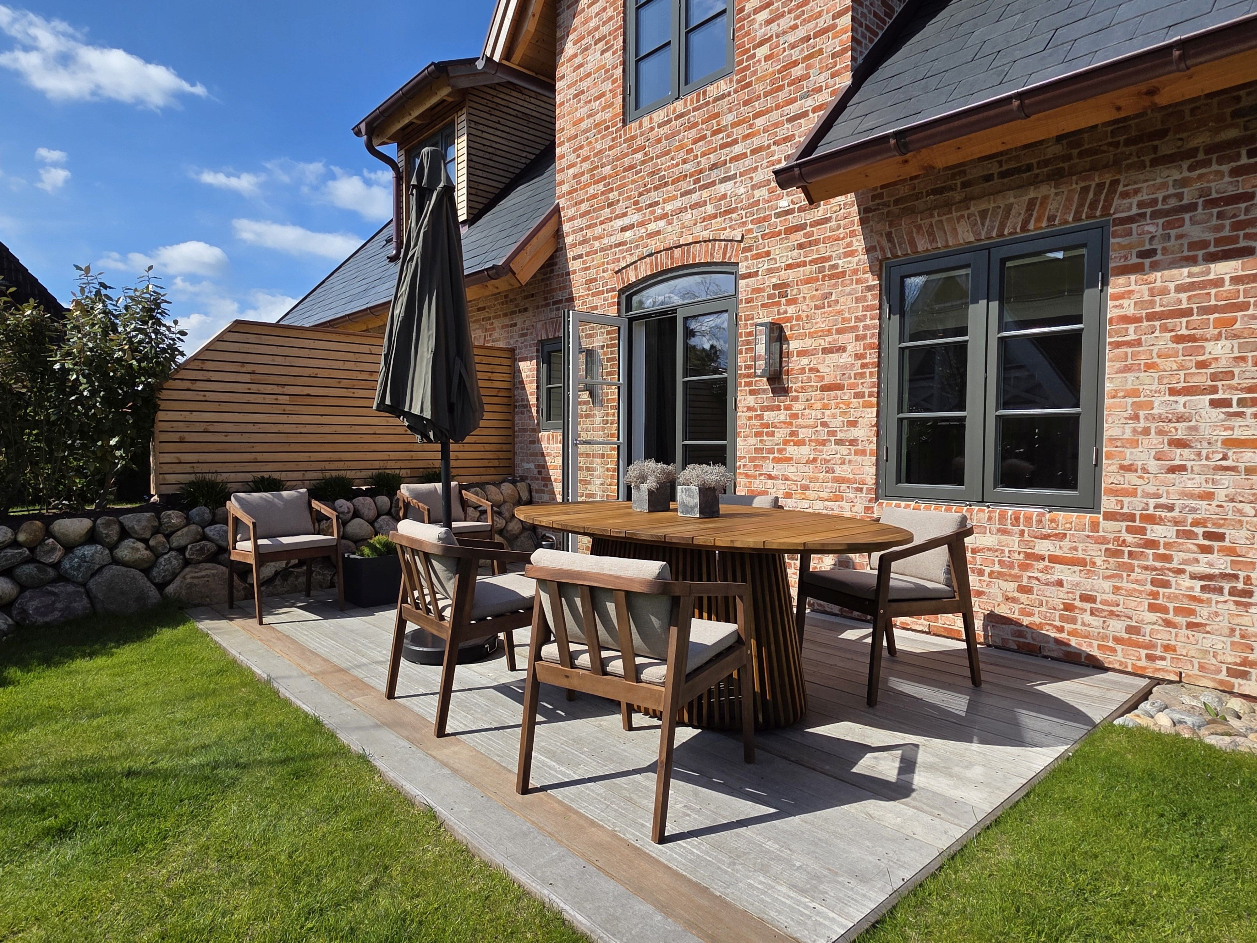 Außenbereich Möblierte Terrasse, Sonnenschirm, Sylt-Strandkorb. Abschließbare Fahrradgarage mit Ladestation für Ihr E-Bike. Es steht Ihnen eine Wallbox 11kW kostenlos zur Verfügung. Ein kostenfreier Parkplatz direkt am Haus. Im Carport,