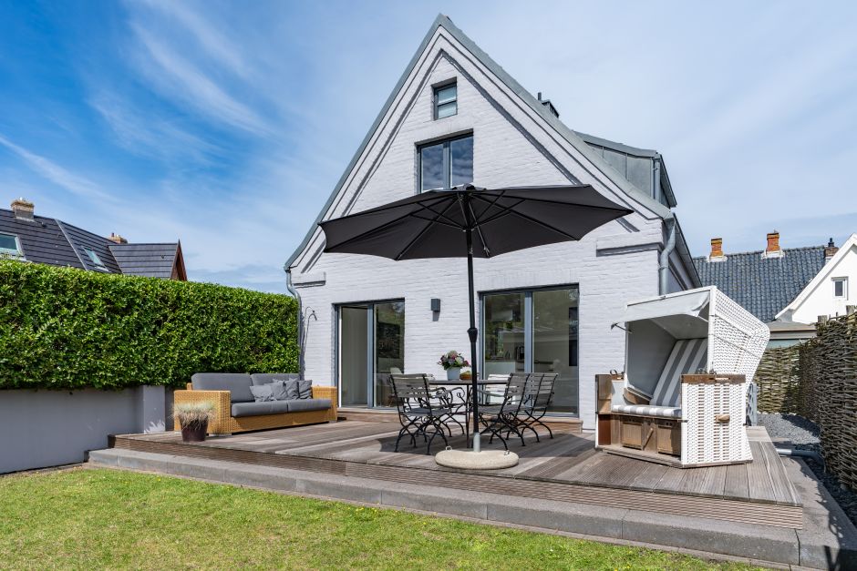 Außenbereich Eigener Garten. Möblierte Holzterrasse nach Süden, Sonnenschirm. Sylt-Strandkorb. Fahrradgarage. Ein kostenfreier Parkplatz direkt am Haus.