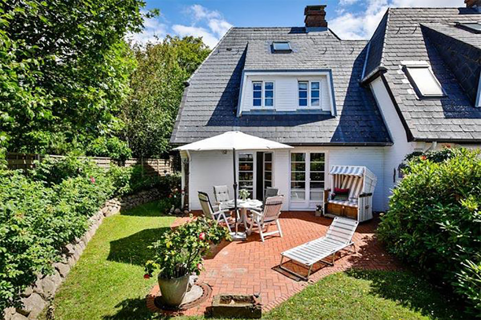 Außenbereich Möblierte Terrasse, Sonnenschirm, Sylt-Strandkorb. Fahrradständer auf dem Grundstück. Ein kostenfreier Parkplatz direkt am Haus.