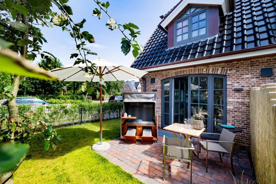 Außenbereich Möblierte Terrasse, Sonnenschirm, Sylt-Strandkorb. Es steht Ihnen eine Wallbox 11kW gegen Gebühr zur Verfügung. Ein kostenfreier Parkplatz direkt am Haus.