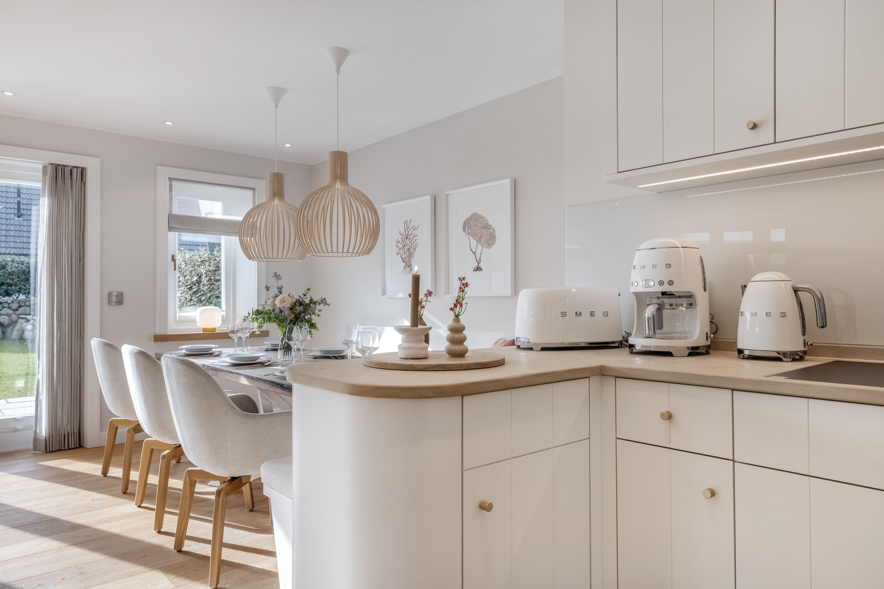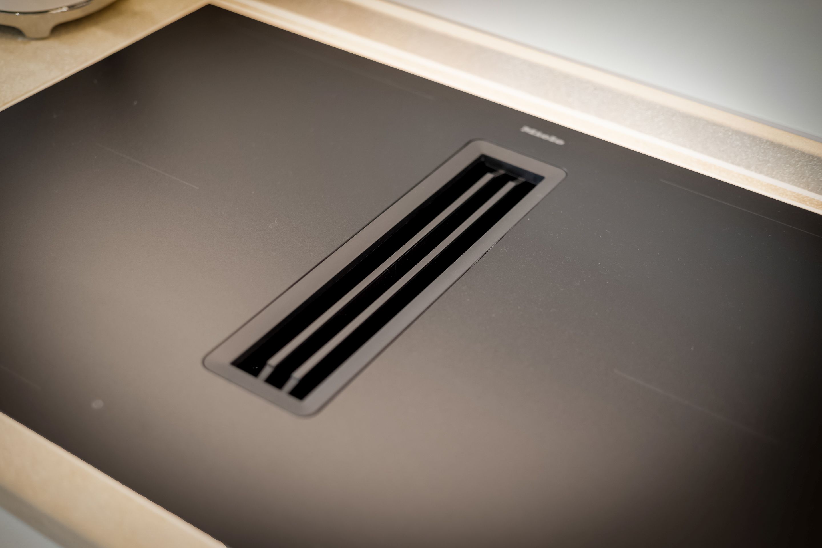 Küche Offene Küche von Schreinerhand mit MIELE Elektrogeräten, Induktionskochfeld mit integriertem Wrasenabzug, Backofen, Mikrowelle, Geschirrspüler, Weinkühlschrank, Espressomaschine (Nespresso), SodaStream. Filter-Kaffeemaschine, elektrischer Wasserkocher und Toaster sind selbstverständlich.