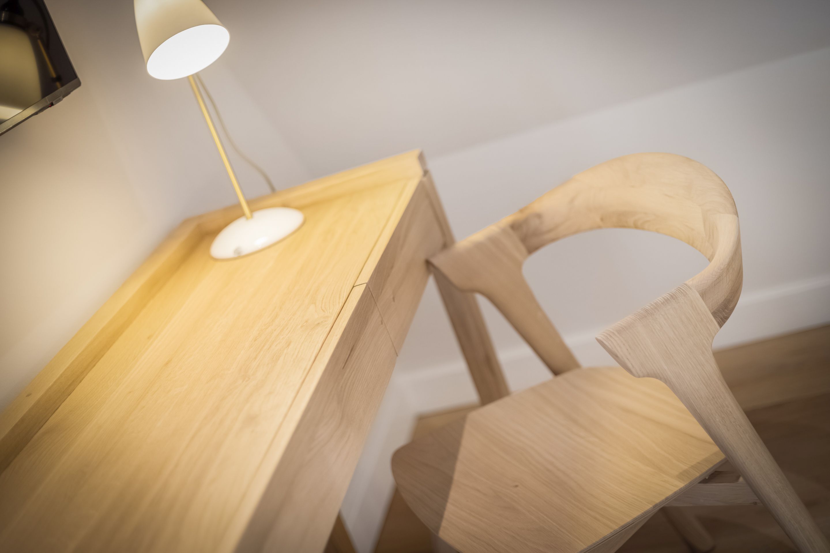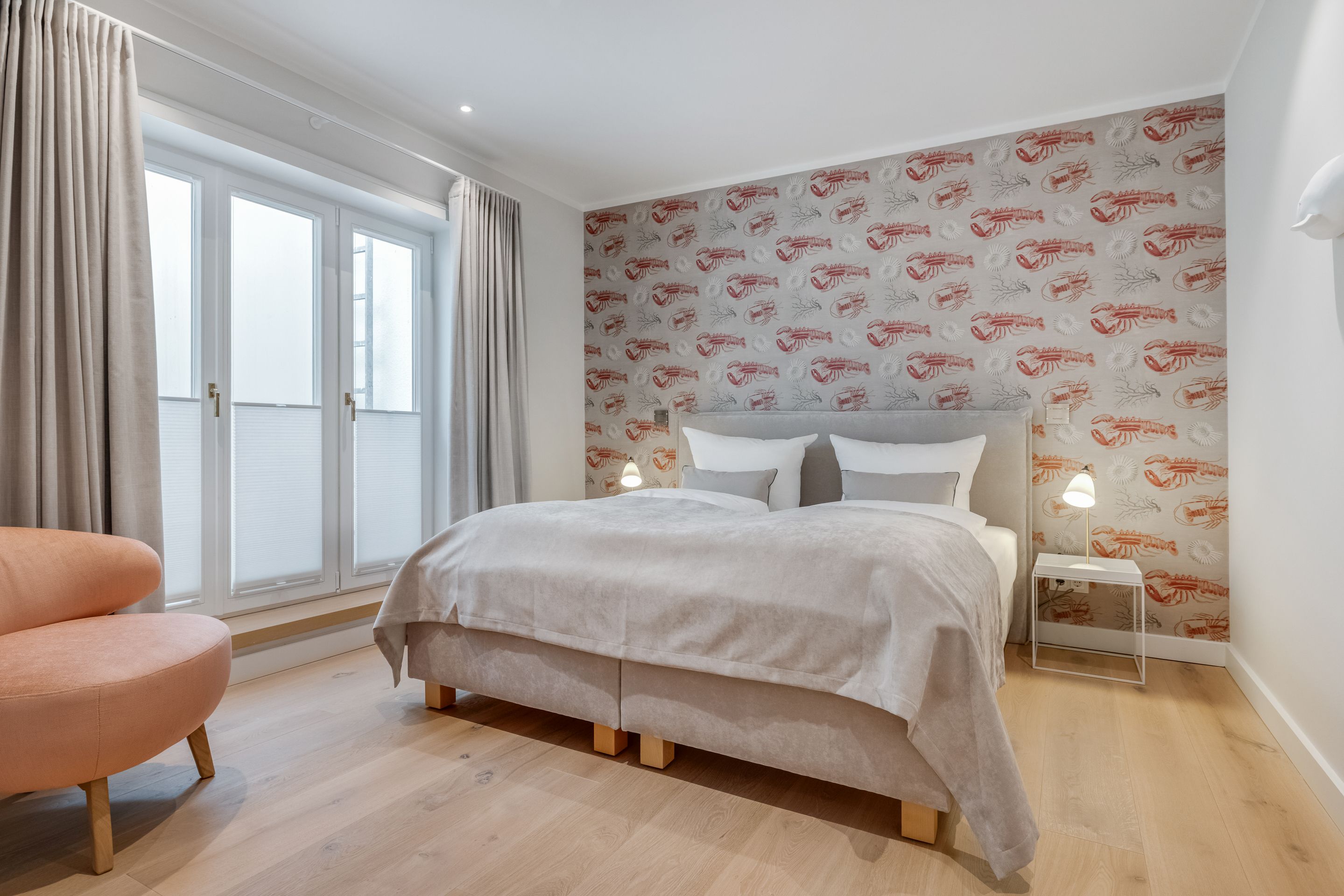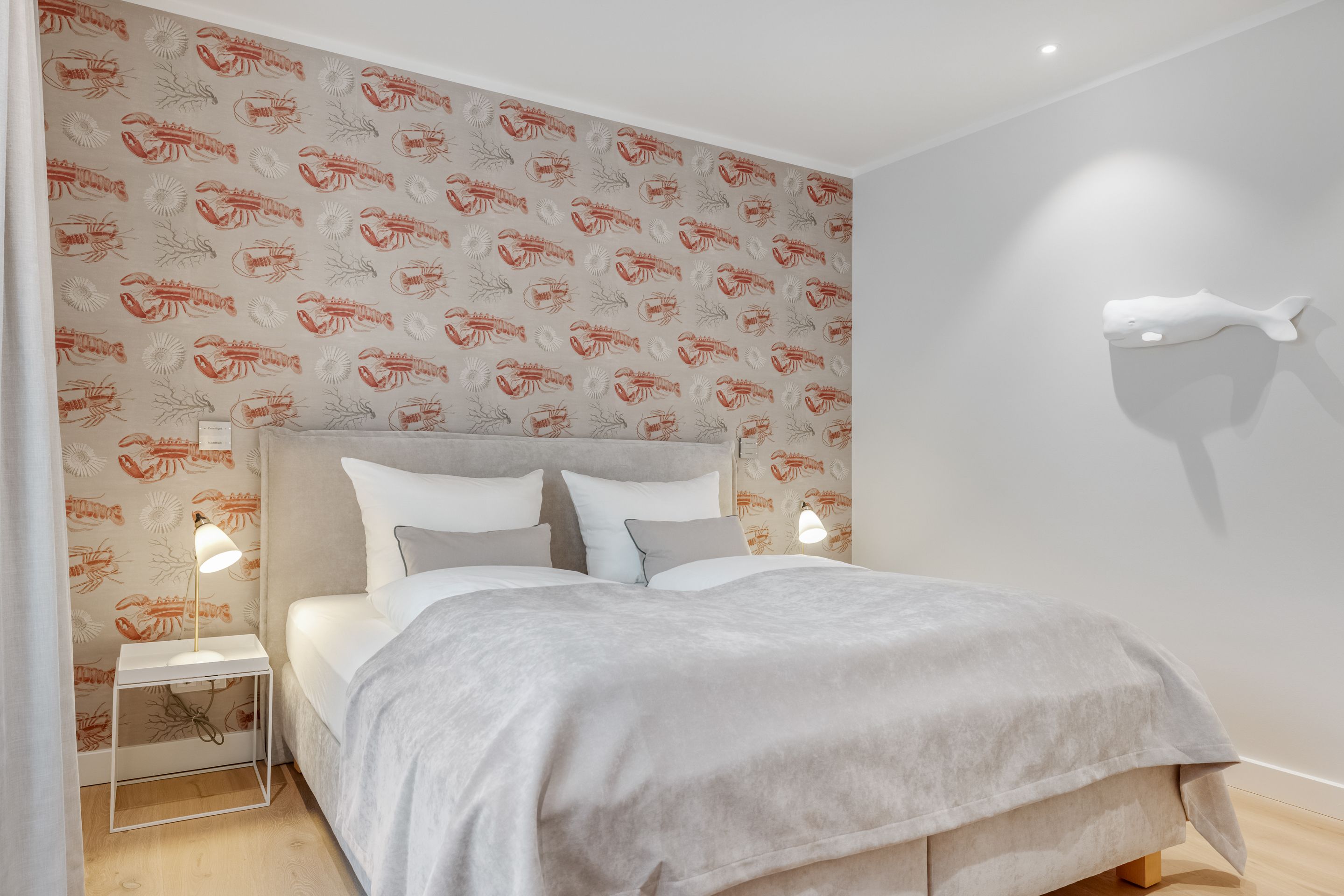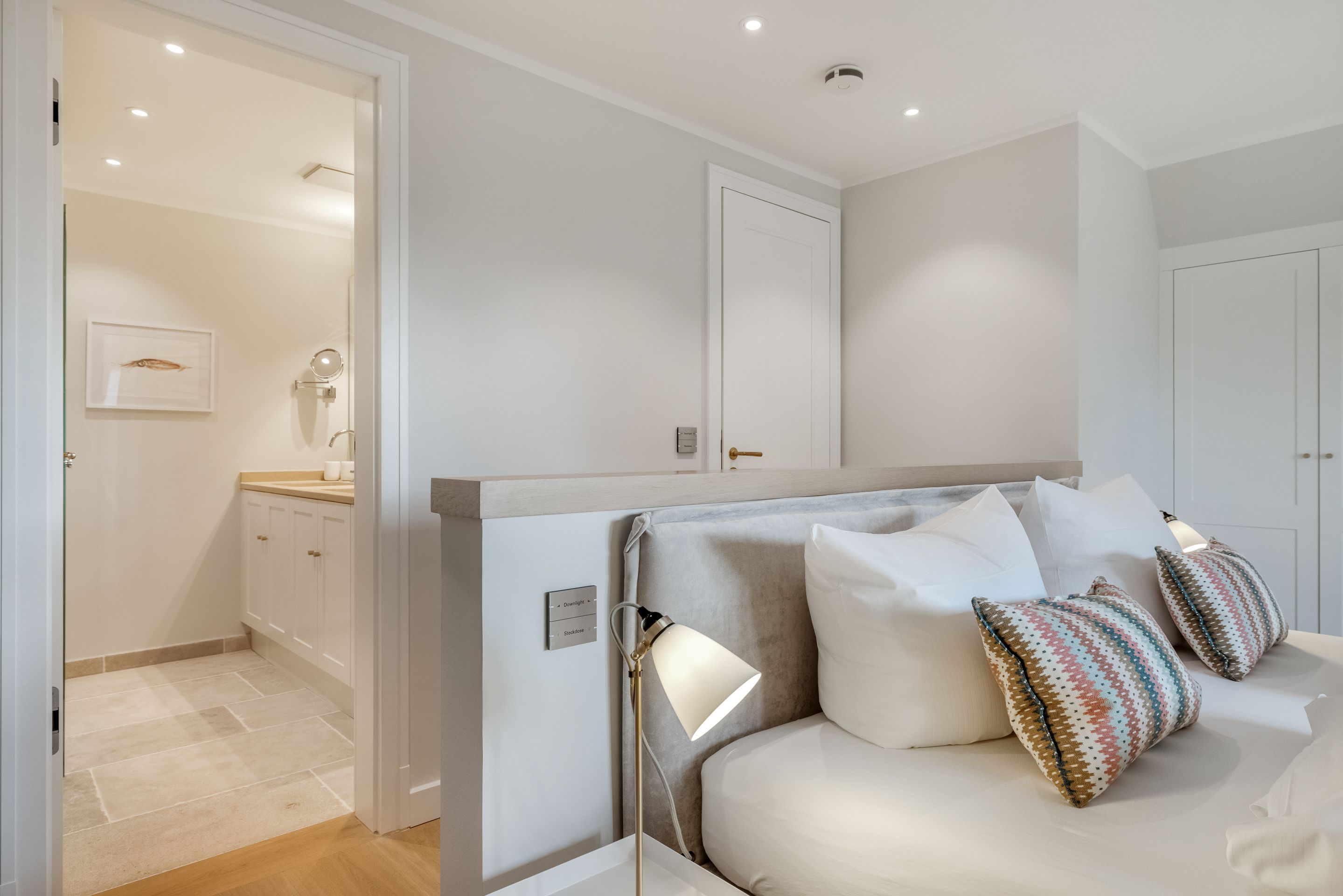 Schlafen Zwei Doppelschlafzimmer mit Boxspringbetten und Einbauschränken. Ein Doppelschlafzimmer vollständig von Tischlerhand gestaltet. Der größte Schlafraum verfügt zusätzlich über eine Schreibgelegenheit und ein Badezimmer en Suite. Alle Betten sind für Sie bezogen! Die Wäsche-Erstausstattung mit Bettwäsche und Handtüchern ist bereits im Mietpreis enthalten.