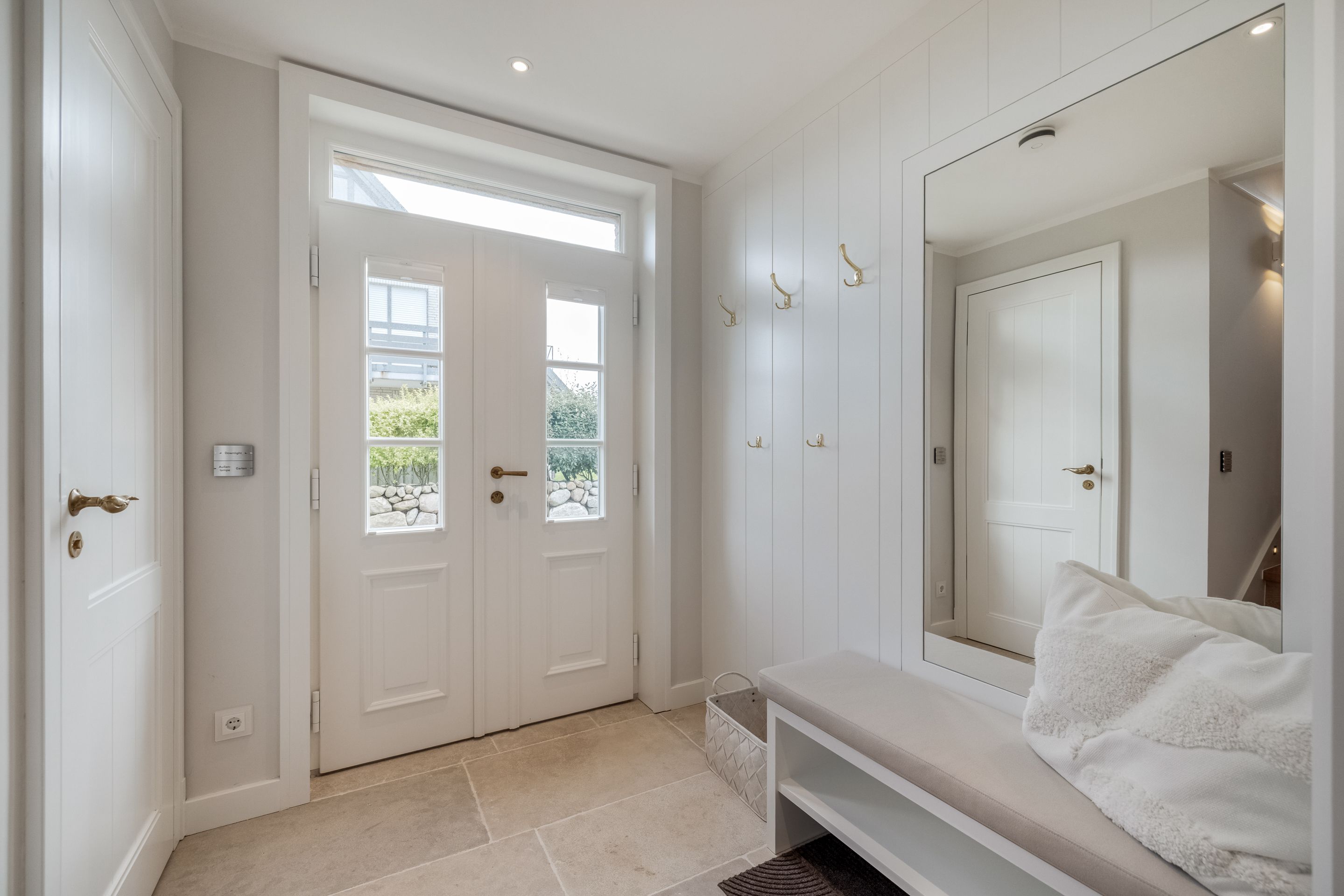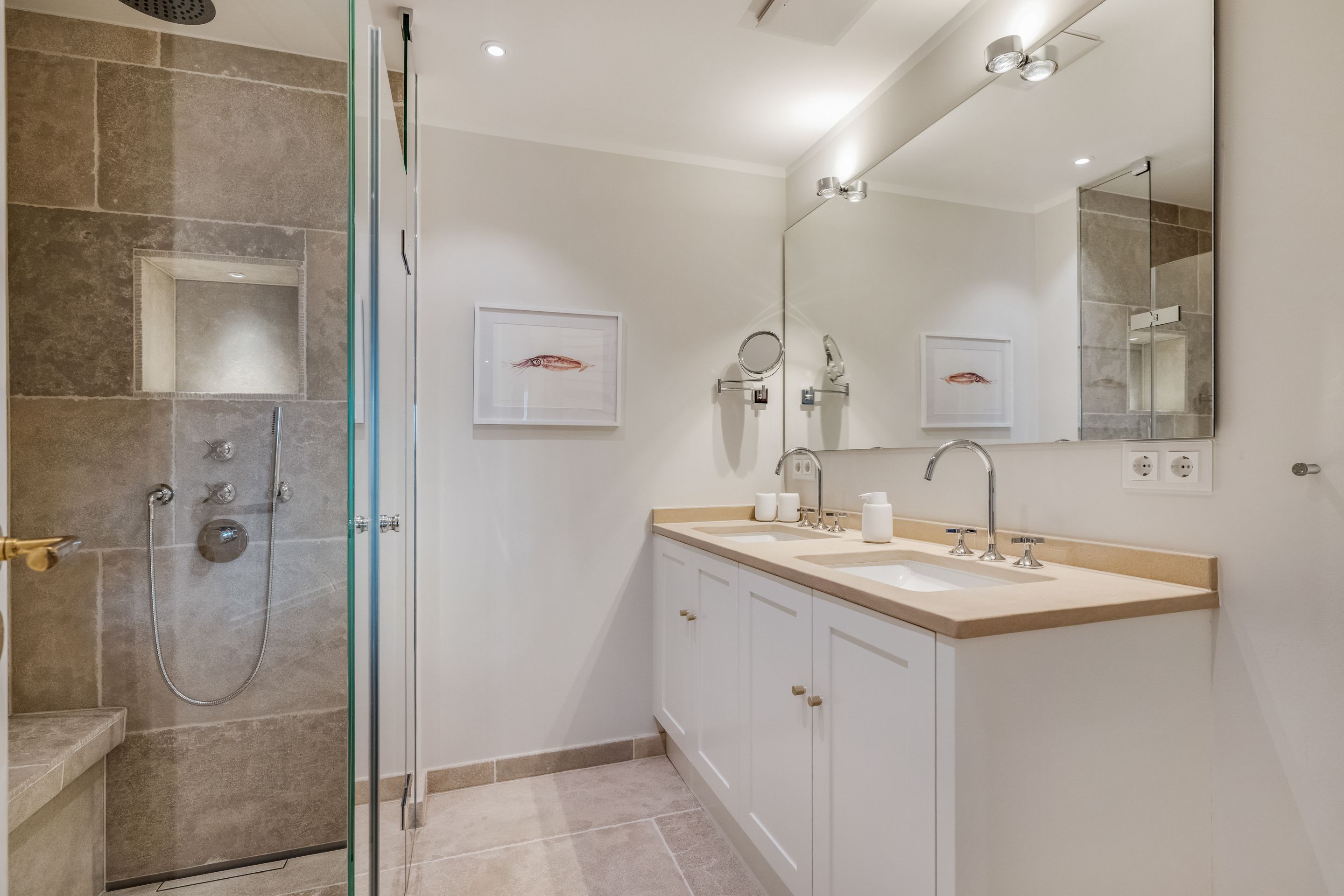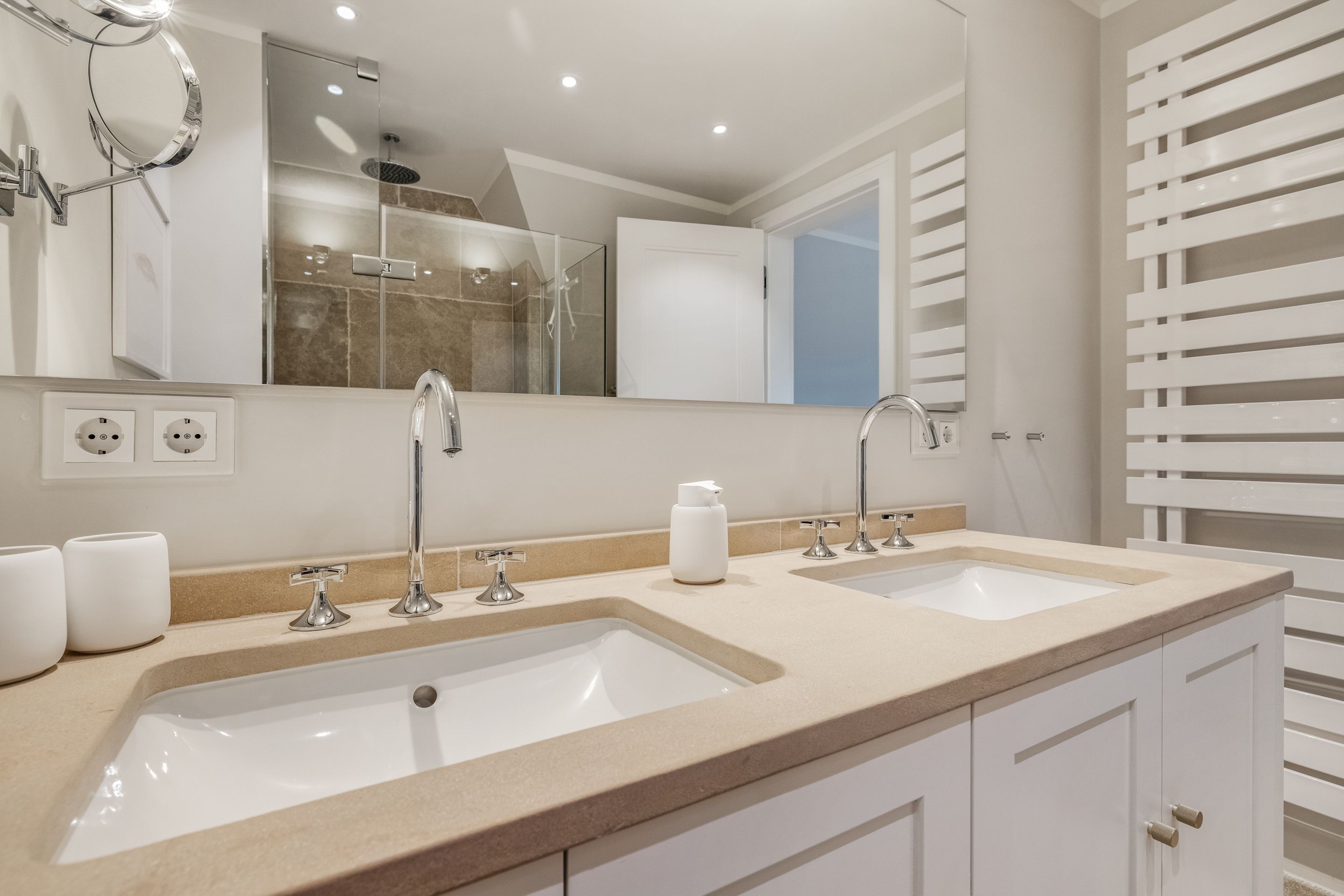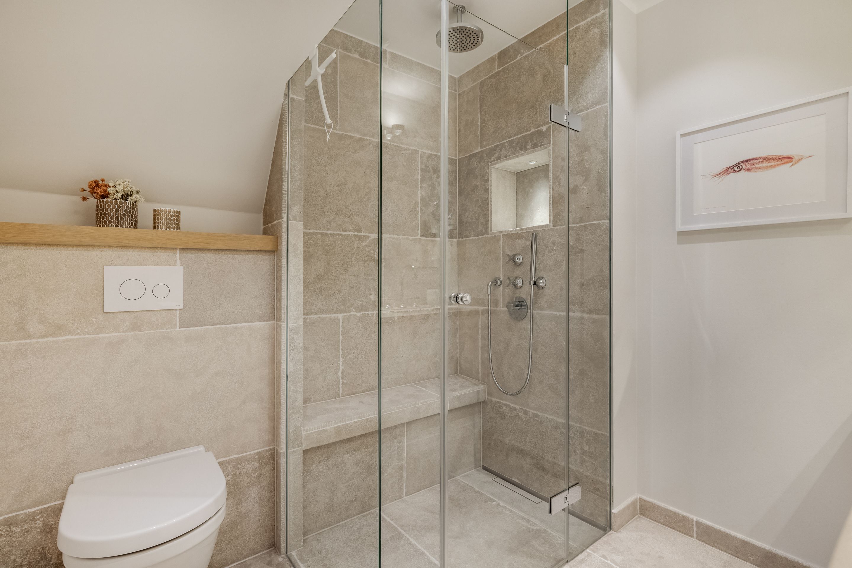 Badezimmer Zwei Limestone-Badezimmer mit Dusche, Rainshower, WC, Waschtisch, Fön und Handtuchtrockner. Davon eines en Suite und mit einem Doppelwaschtisch ausgestattet. Wellnessbadezimmer mit Dusche, Rainshower, Badewanne, Waschtisch, Fön und Handtuchtrockner. Separates WC. Ein Gäste-WC im Erdgeschoss.