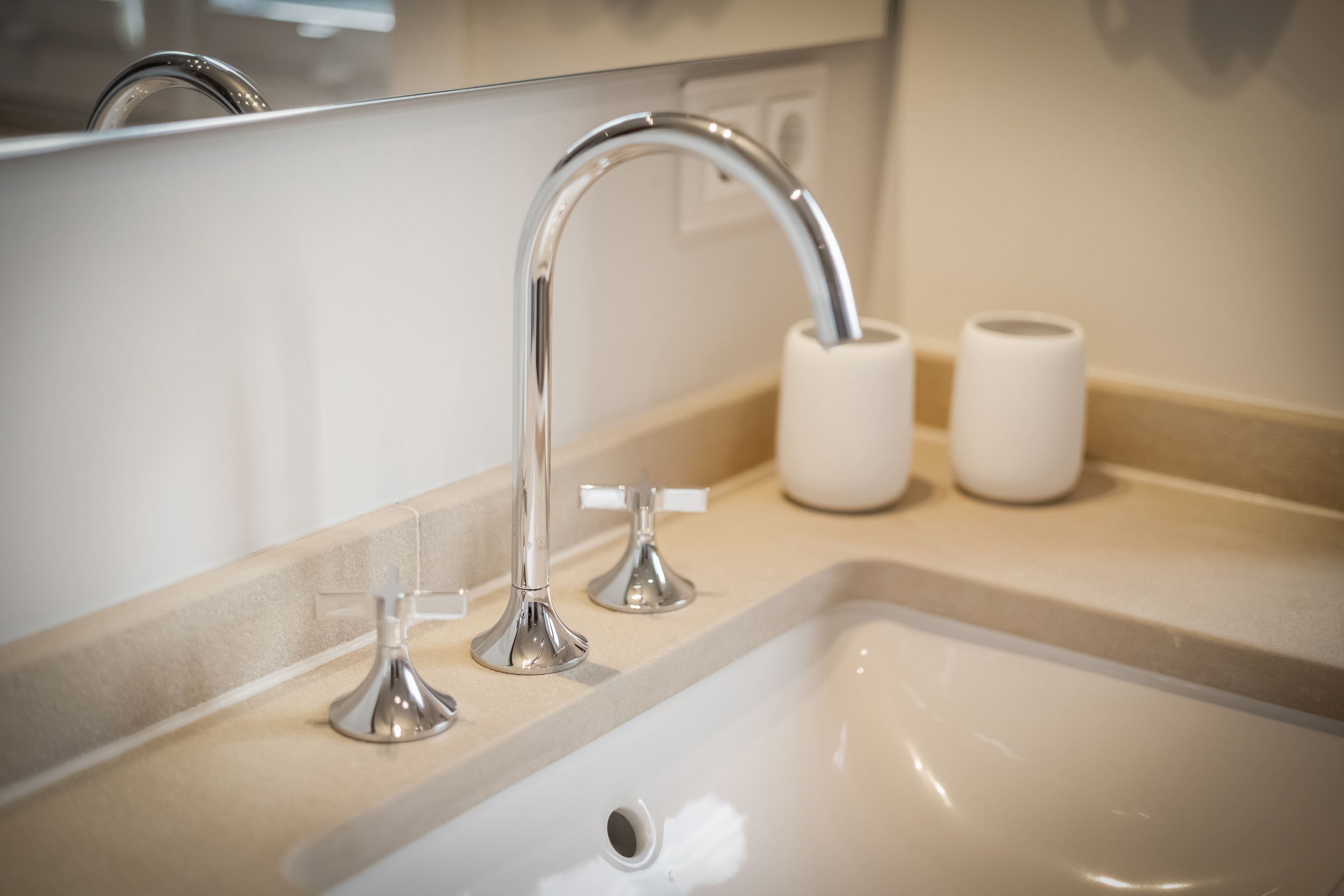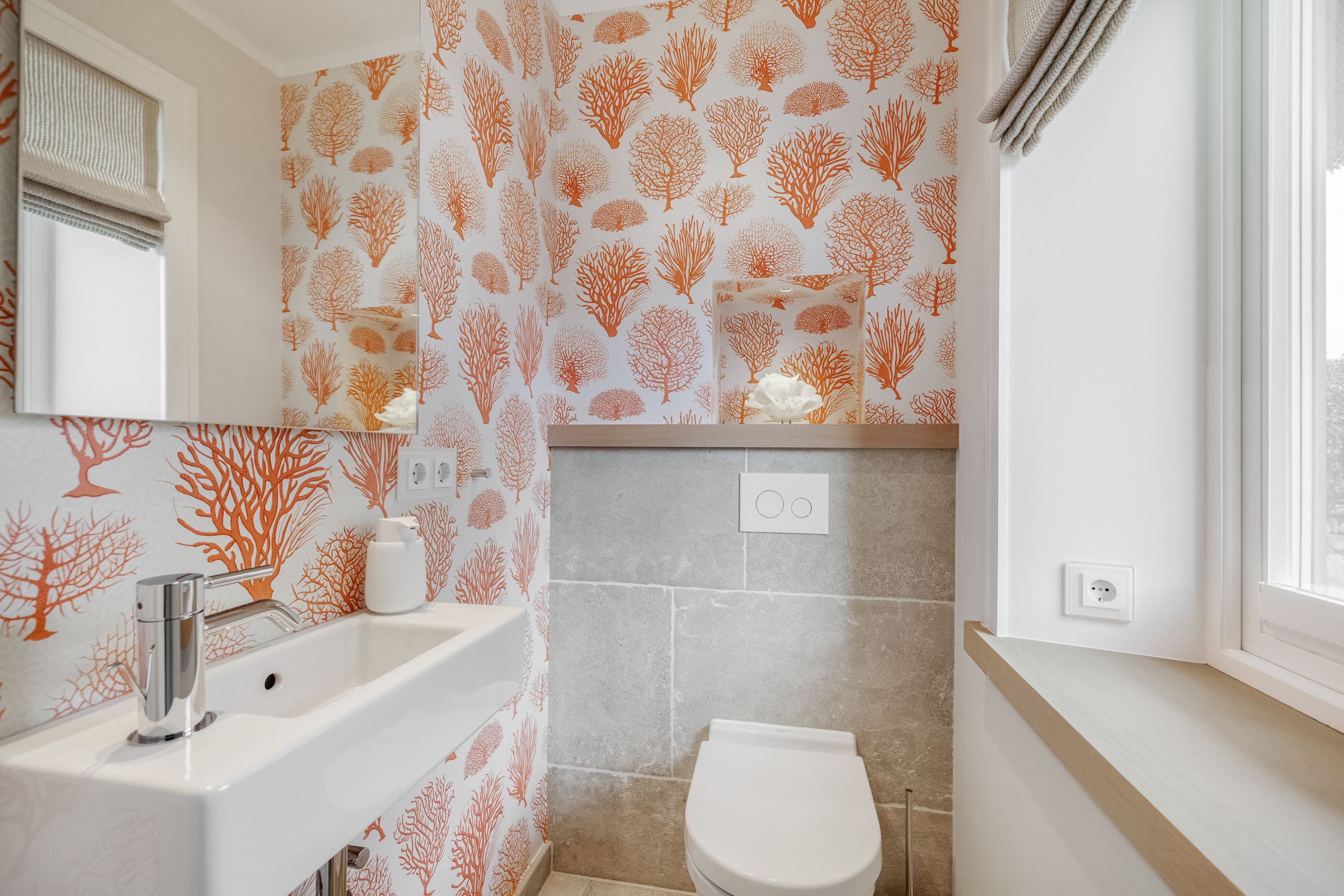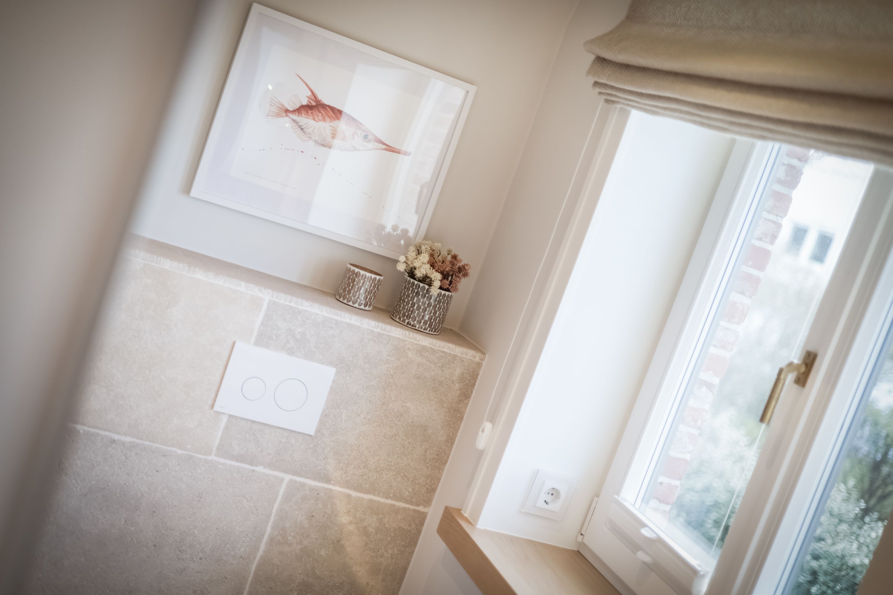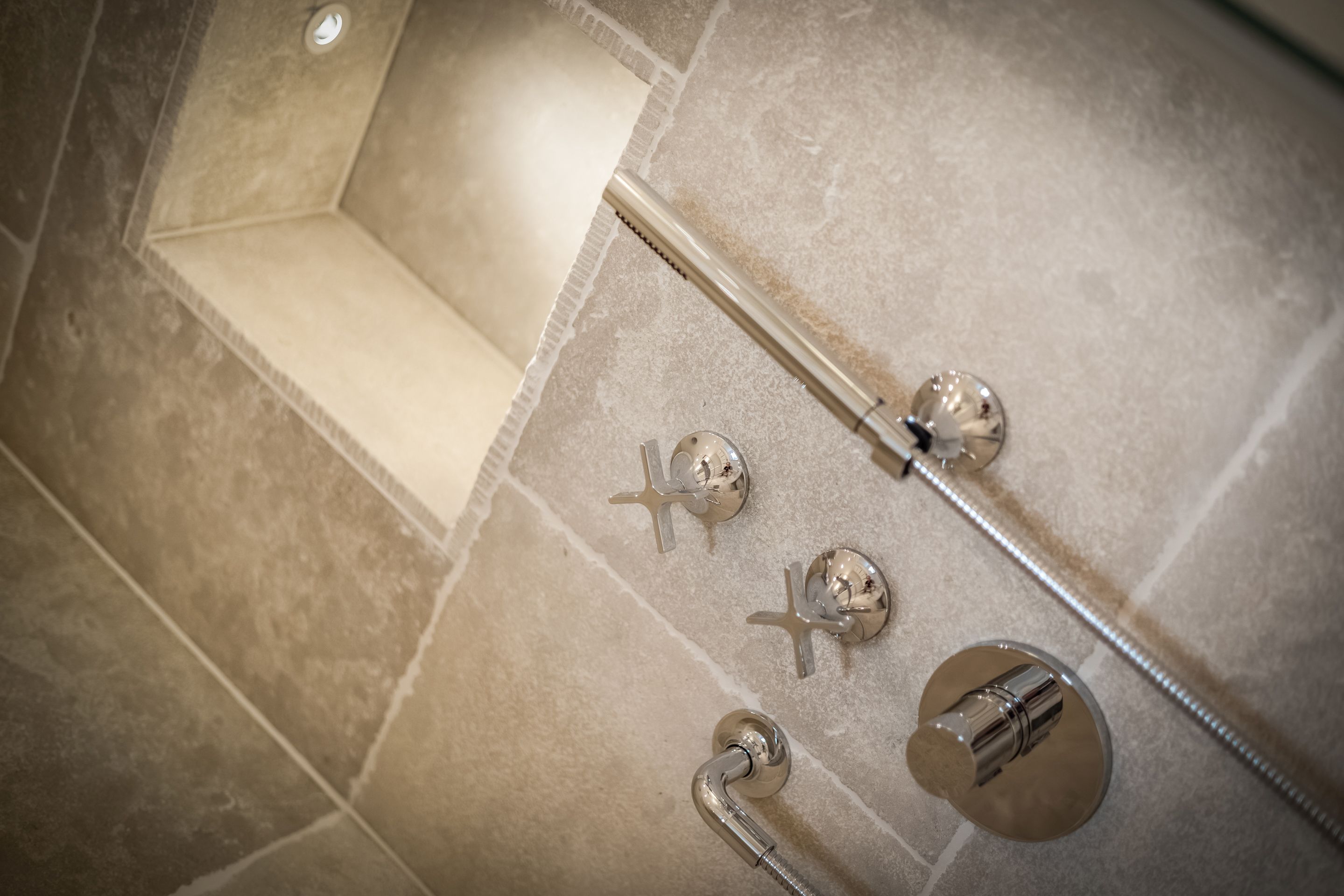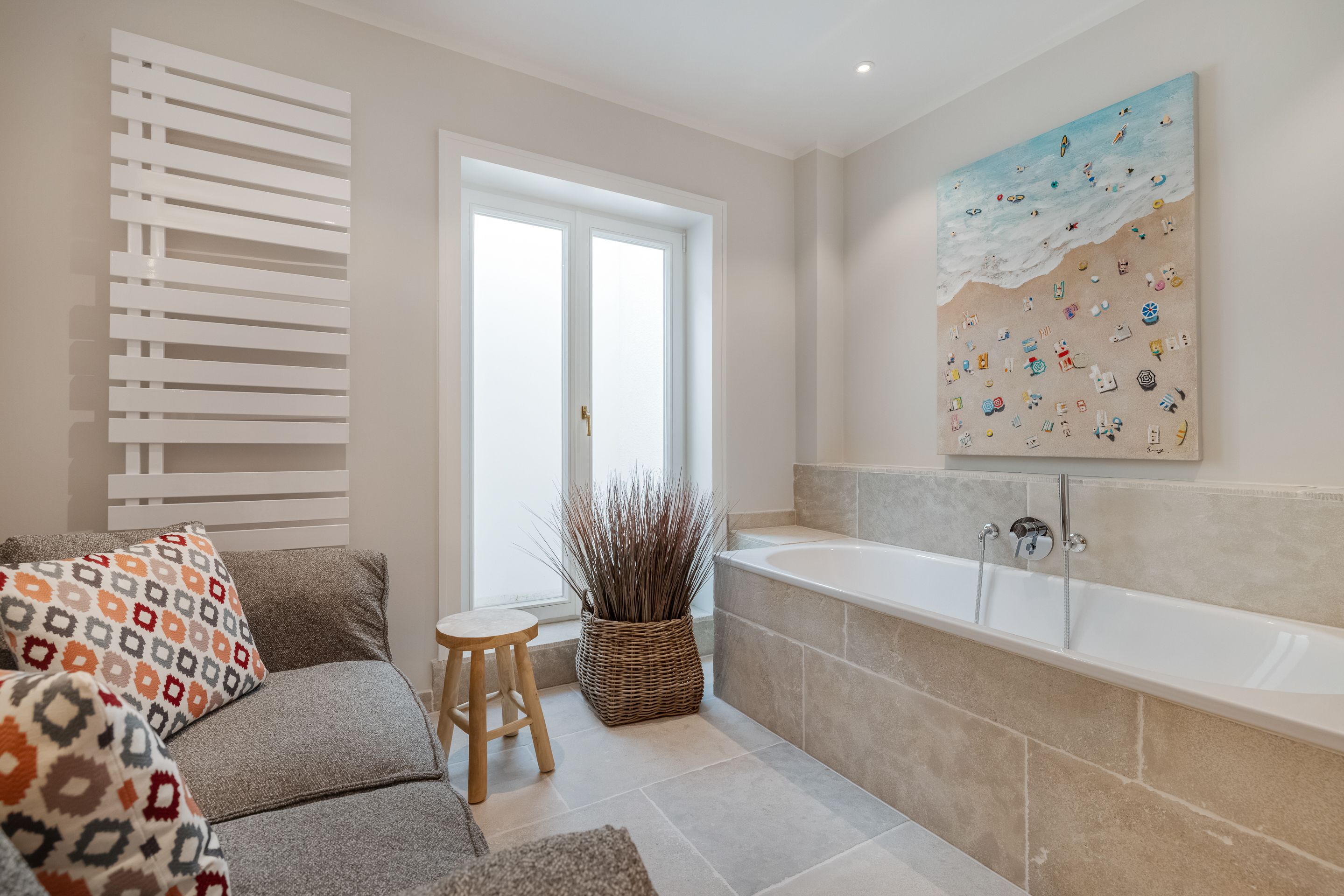Badezimmer Zwei Limestone-Badezimmer mit Dusche, Rainshower, WC, Waschtisch, Fön und Handtuchtrockner. Davon eines en Suite und mit einem Doppelwaschtisch ausgestattet. Wellnessbadezimmer mit Dusche, Rainshower, Badewanne, Waschtisch, Fön und Handtuchtrockner. Separates WC. Ein Gäste-WC im Erdgeschoss.
