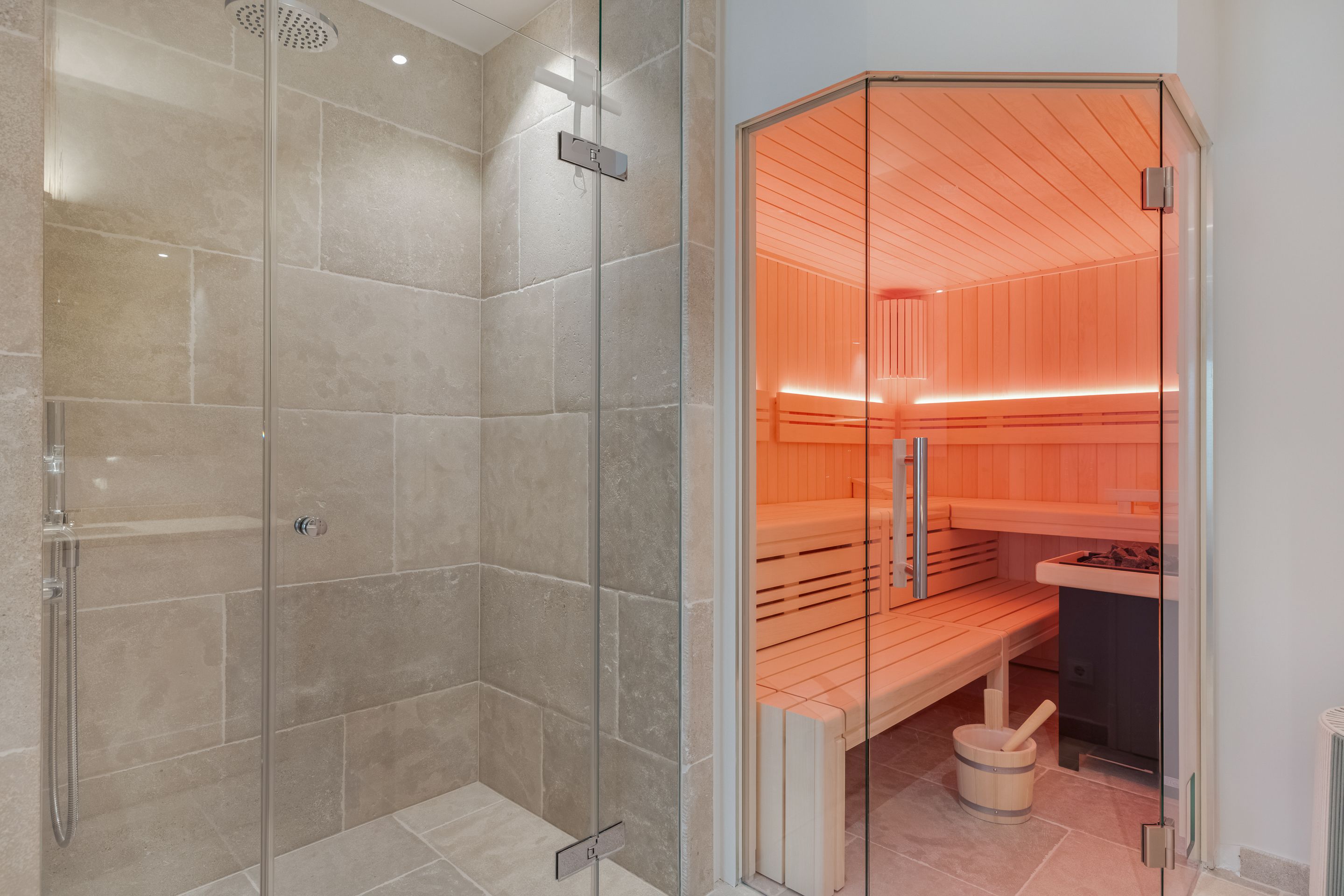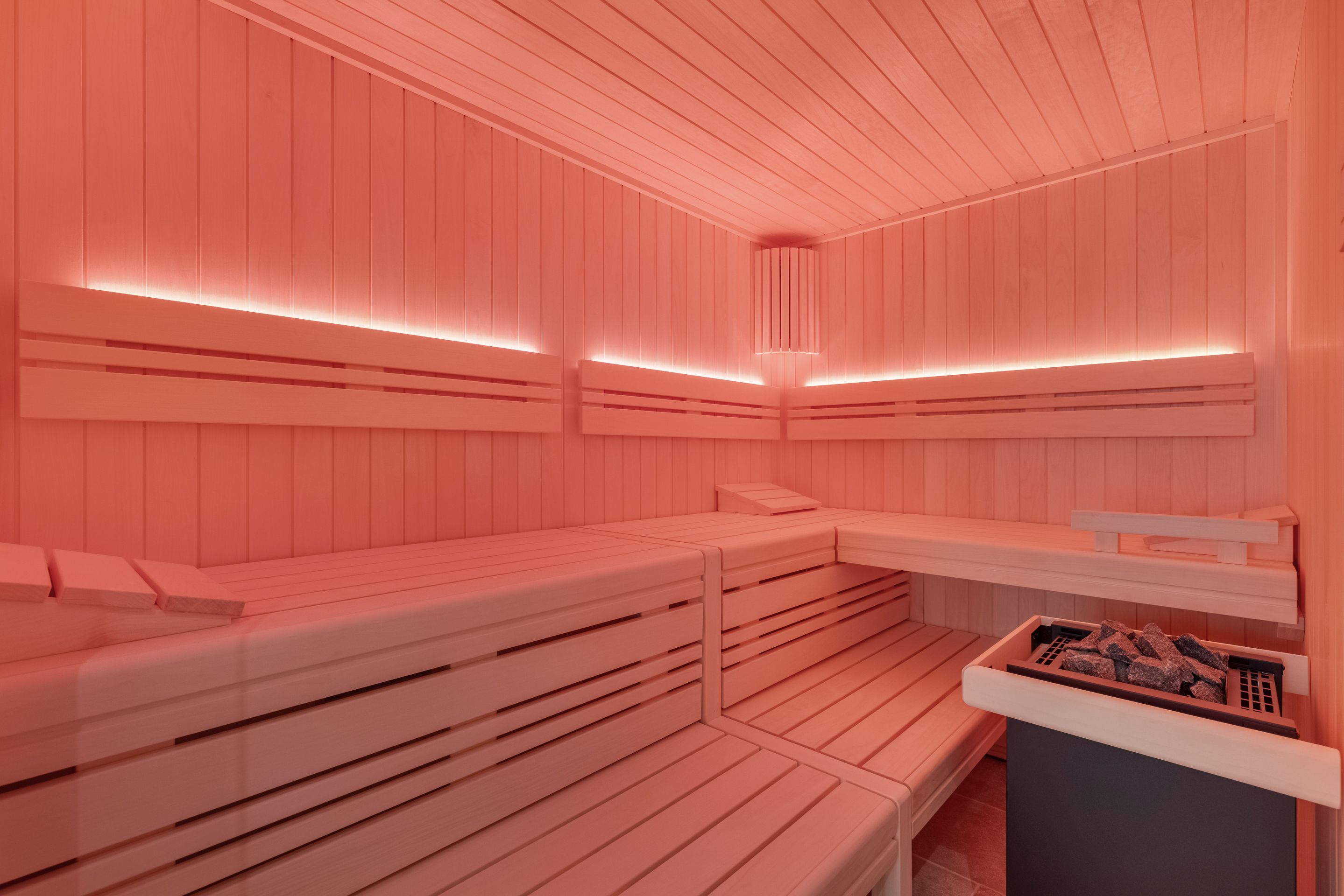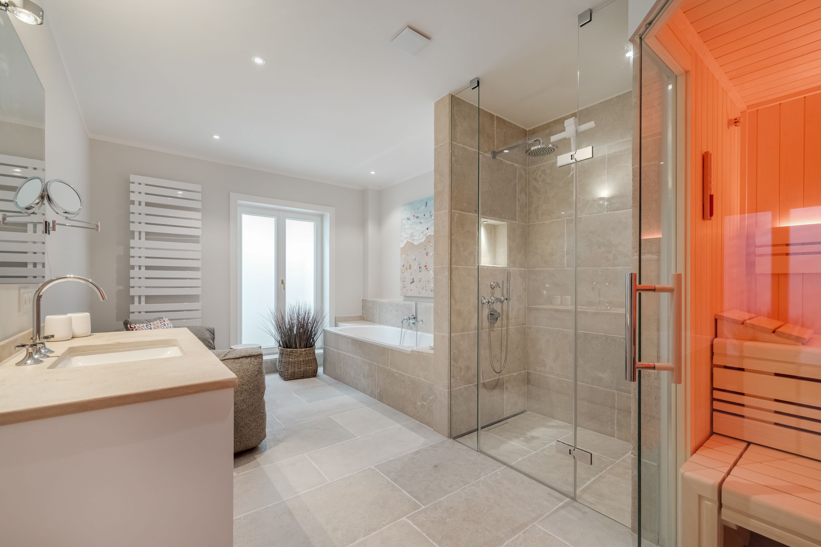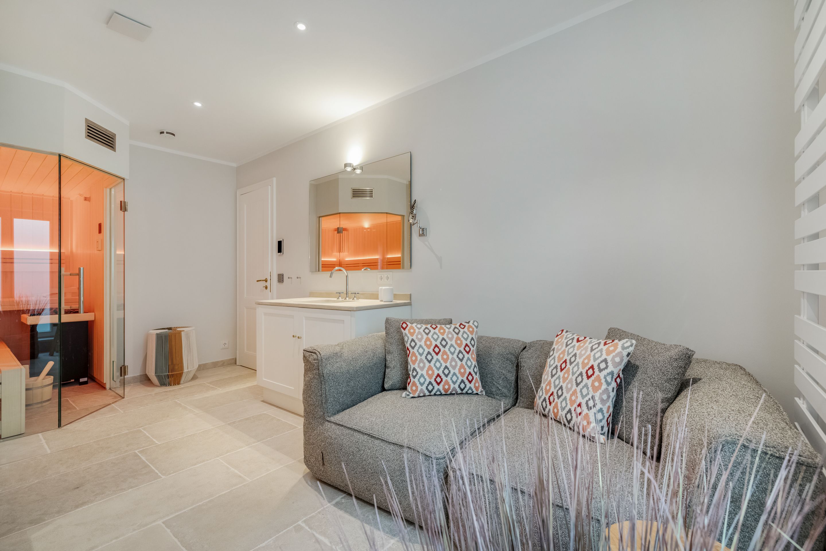 Wellness Das Wellnessbad beinhaltet eine große Finnische Sauna mit einem 2-er Sofa von Blomus.