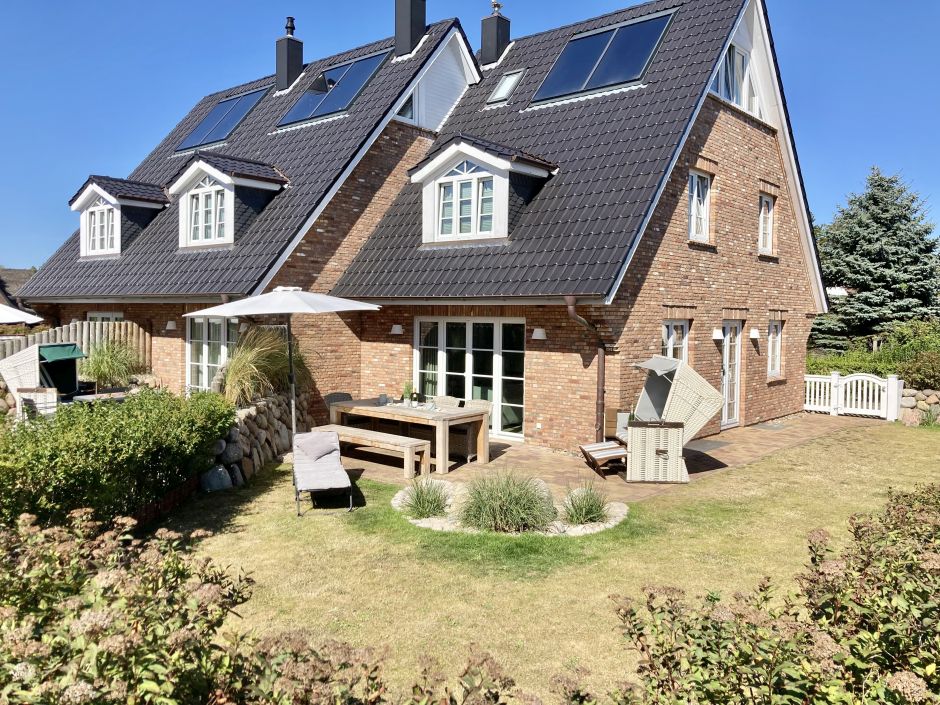 Im Friesenwall eingefasster, großer eigener Garten, möblierte Terrasse, Sonnenschirm, Sylt-Strandkorb.