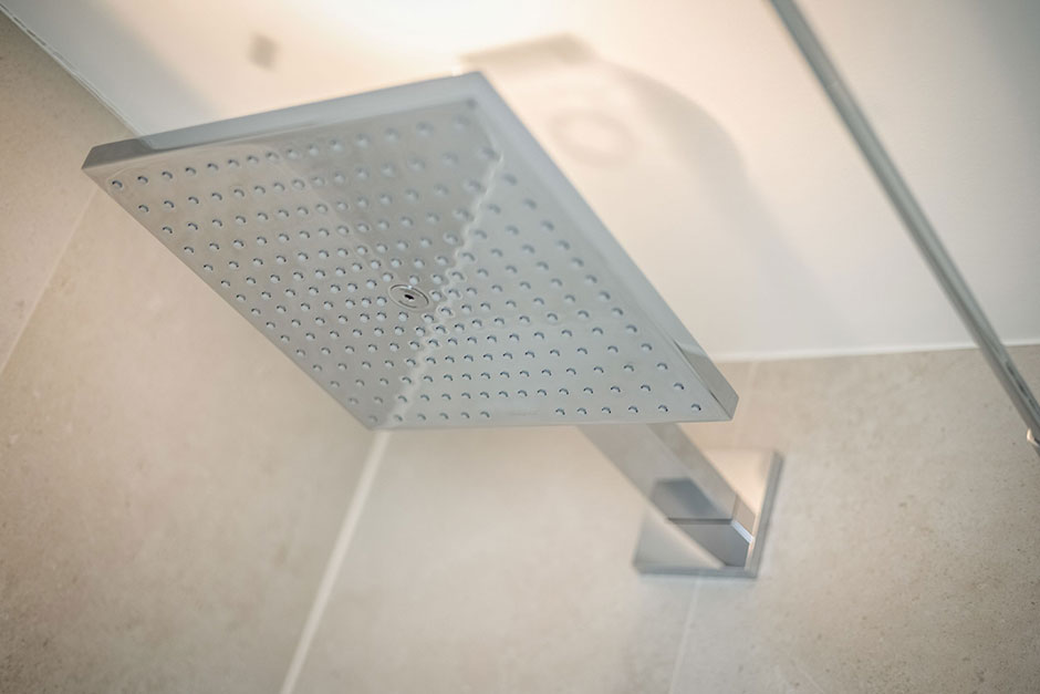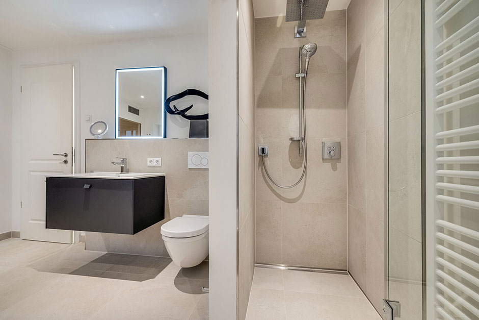 Ein Badezimmer mit Dusche, Rainshower, WC, Waschtisch, Handtuchtrockner und Fön.