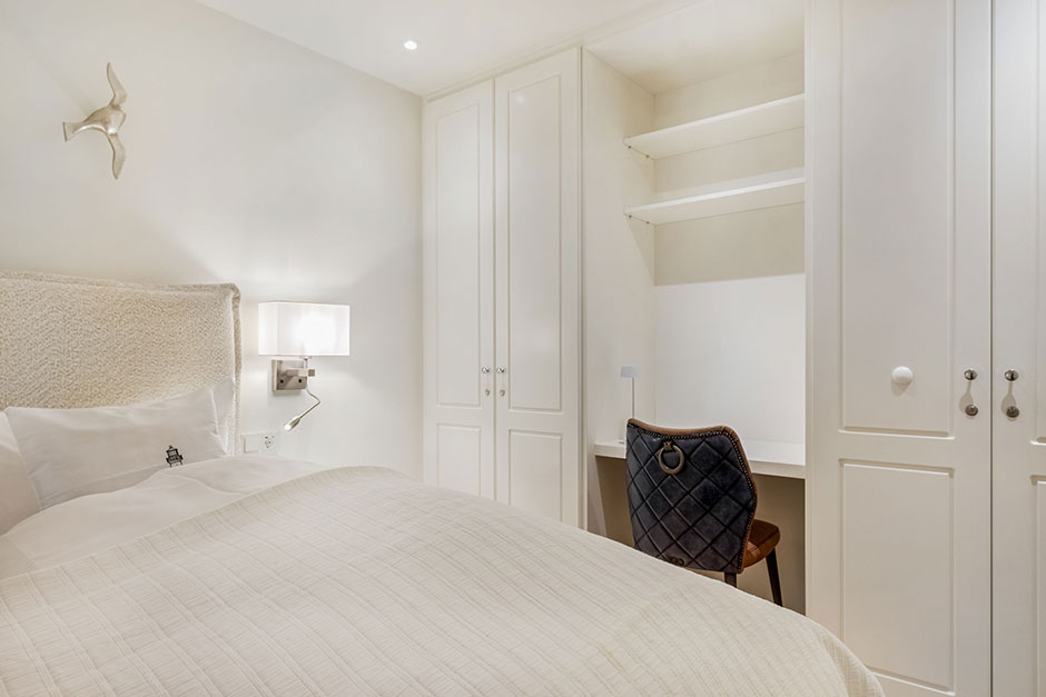 In einem Doppelschlafzimmer Boxspringbetten und eine Schreibgelegenheit.