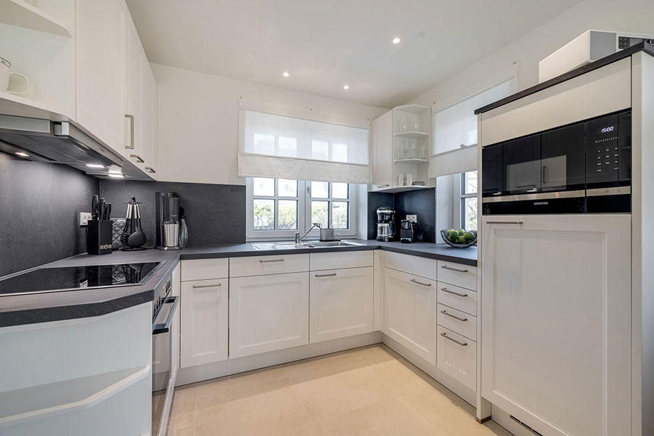 Offene, helle Landhausküche mit Ceran-Kochfeld, Backofen, Mikrowelle, Geschirrspüler, Espressomaschine (Nespresso), SodaStream. Filter-Kaffeemaschine, elektrischer Wasserkocher und Toaster sind selbstverständlich.