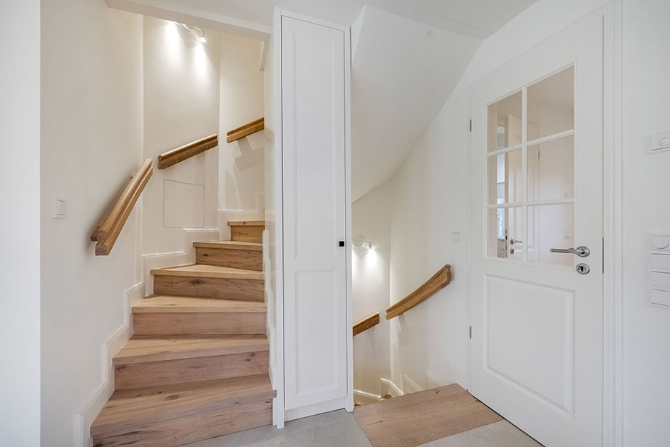 Alle Räume sind mit Landhausdiele oder Feinsteinzeugplatten und Fußbodenheizung ausgestattet.