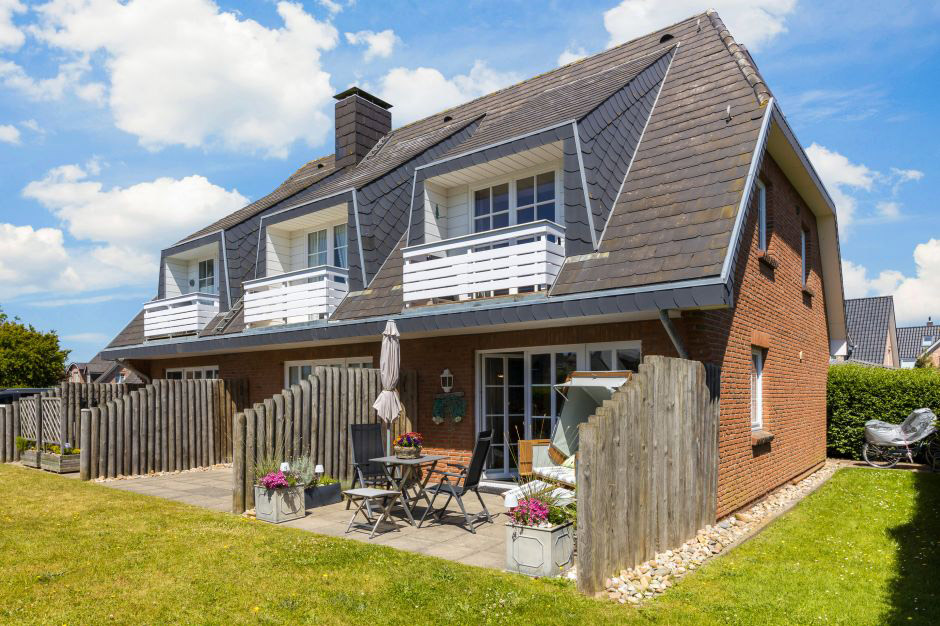 Außenbereich Möblierte Terrasse, Sonnenschirm, Sylt-Strandkorb. Ein kostenfreier Parkplatz direkt am Haus. Nr. 1