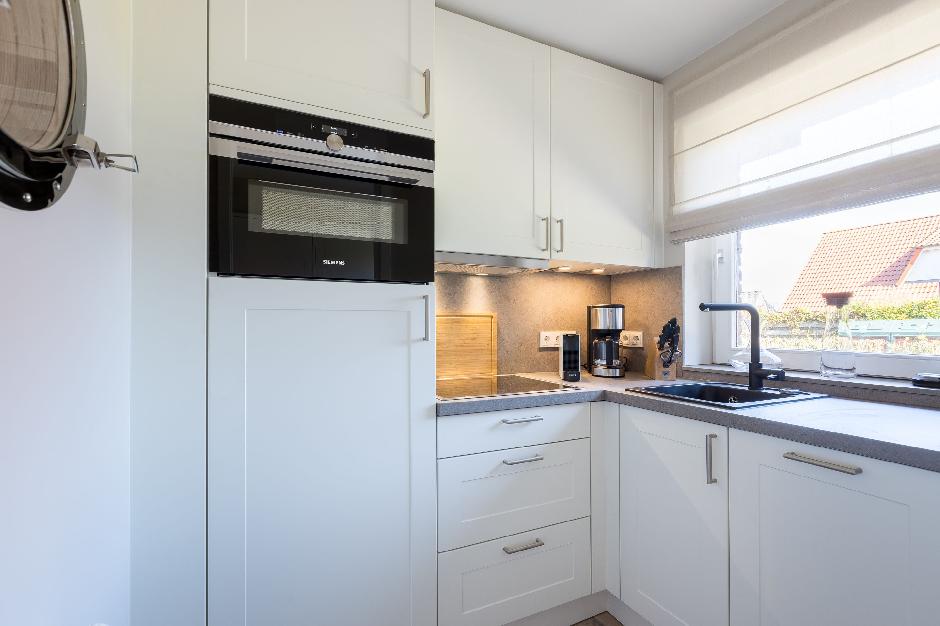 Separate Küche mit Ceran-Kochfeld, Backofen mit Mikrowellenfunktion, Mikrowelle, Geschirrspüler, Espressomaschine (Nespresso), SodaStream. Filter-Kaffeemaschine, elektrischer Wasserkocher und Toaster sind selbstverständlich.