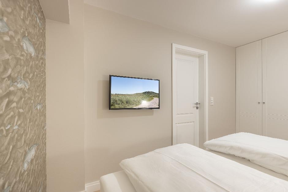 Zwei Doppelschlafzimmer mit Boxspringbetten und Einbauschränken.