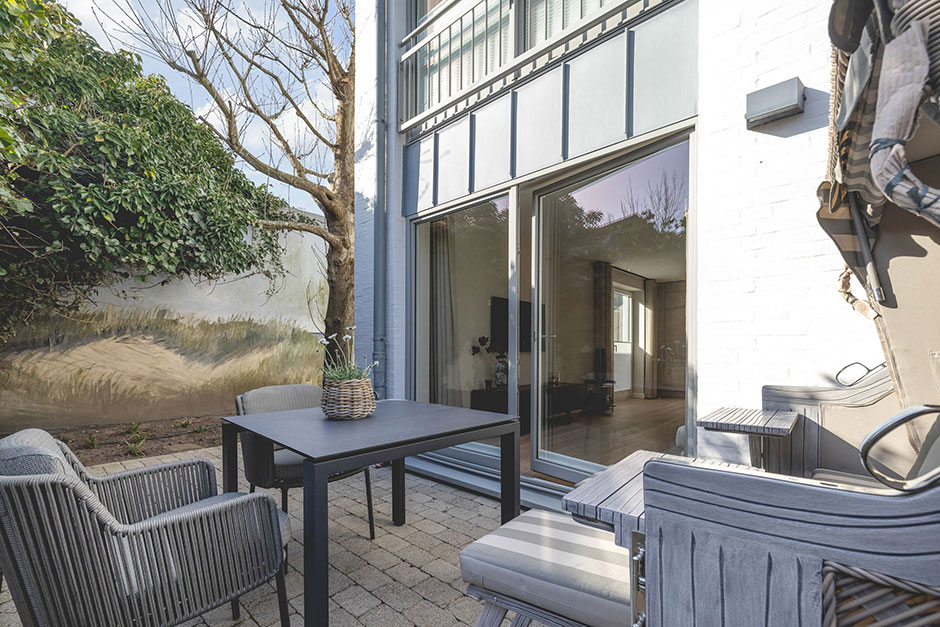 Möblierte Terrasse nach Süden ausgerichtet, Sylt-Strandkorb.