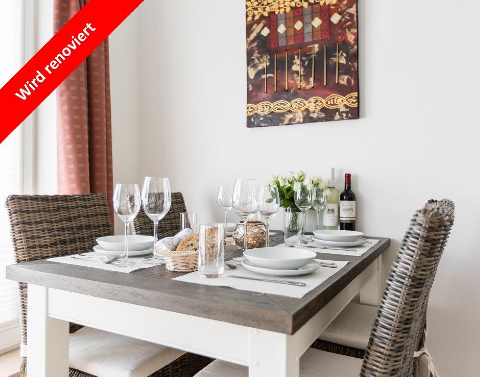 Wohnen Wohnzimmer mit bequemer Sitzgarnitur und gemütlichem Essplatz. Echtholzparkett im Wohn- und Schlafraum.