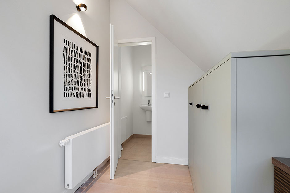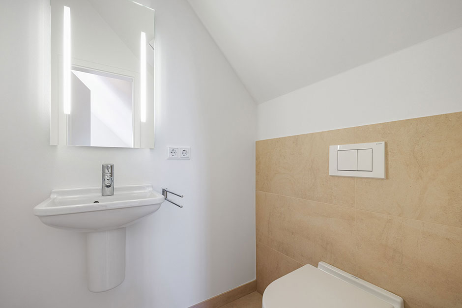 Badezimmer Ein Bad mit Dusche, WC, Waschtisch, Handtuchtrockner und Fön. Ein Gäste-WC.