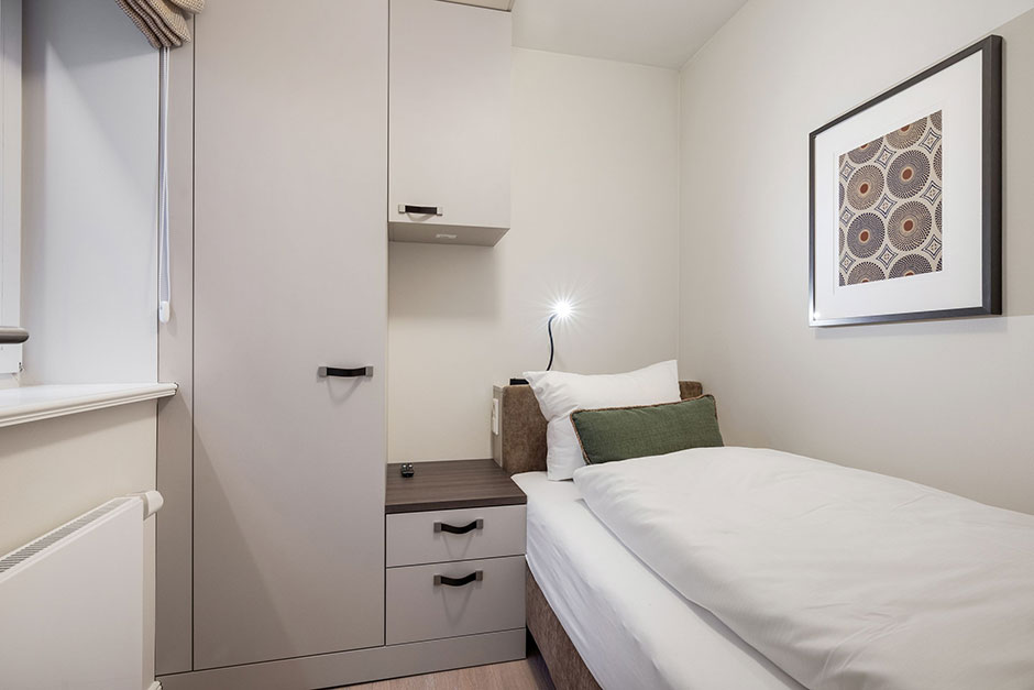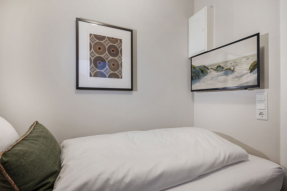 Schlafen Ein Doppelschlafzimmer. Ein Einzelzimmer. Beide Schlafräume sind mit Boxspringbetten und Einbauschränken mit einem großzügigen Platzangebot ausgestattet. Alle Betten sind für Sie bezogen! Die Wäsche-Erstausstattung mit Bettwäsche und Handtüchern ist bereits im Mietpreis enthalten.