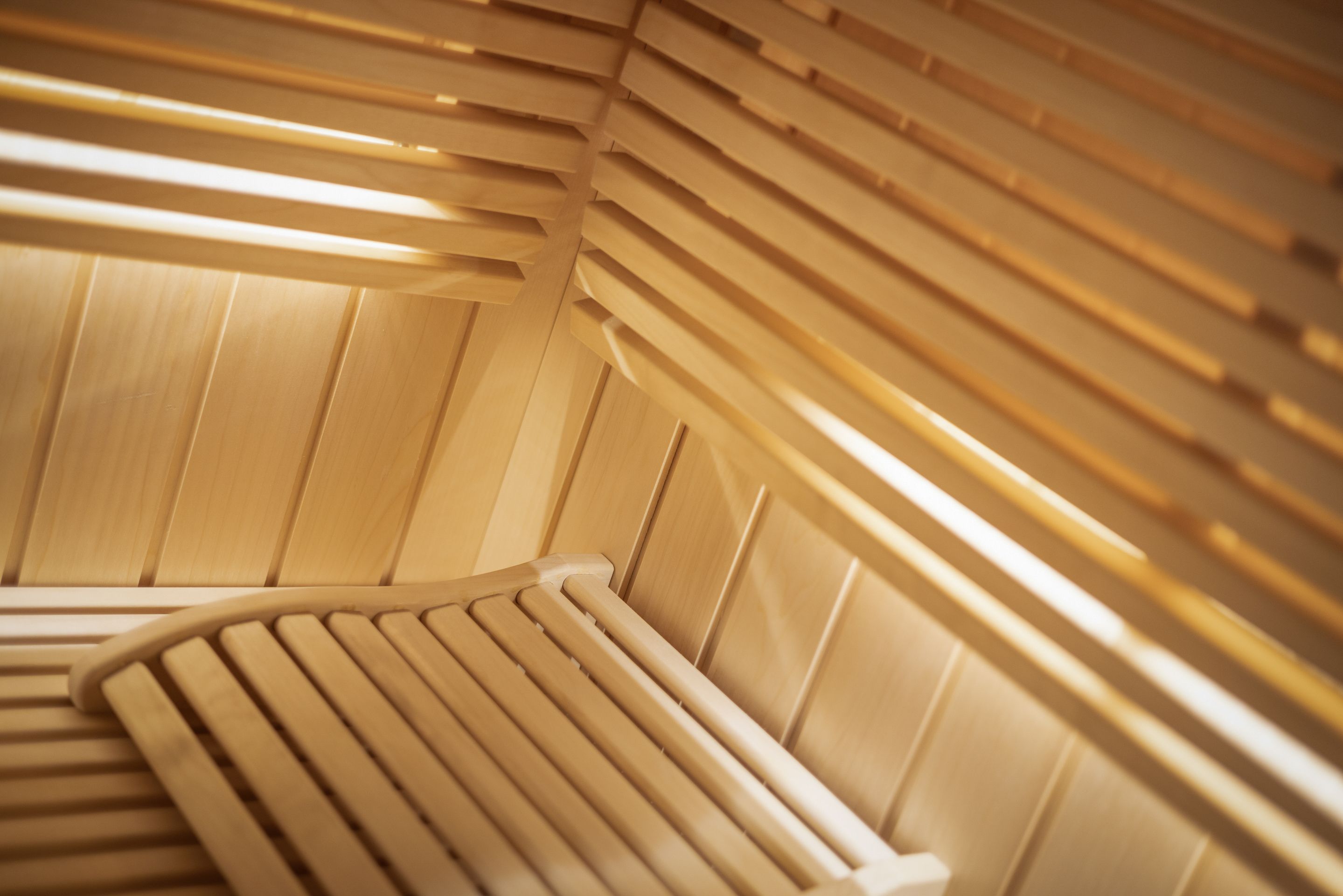 Wellness Finnische Sauna. Ein Ruheraum mit einem chilligen Blomus-Sofa.